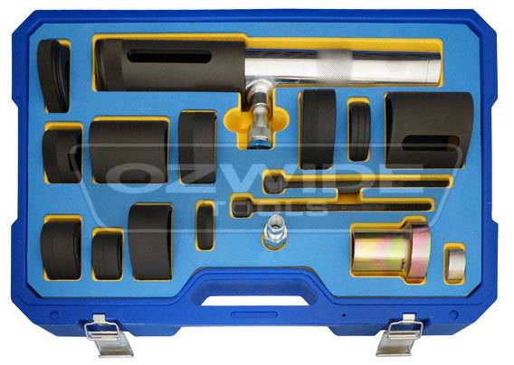 This kit is used to remove and install the metallic bushing in the traction strut / control arm on the car without disassembling the arm. It's design allows for precise installation of the bush in the correct position without the necessity of alignment of the bush after installation.