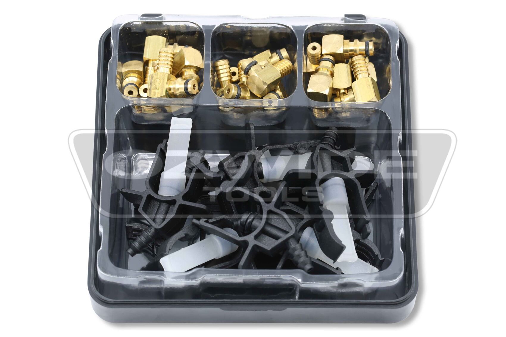 This kit is designed for non pressurised return, solenoid type systems. It comes with a range of fittings to suit Bosch, Delphi, Denso, VDO/ Siemens injectors.