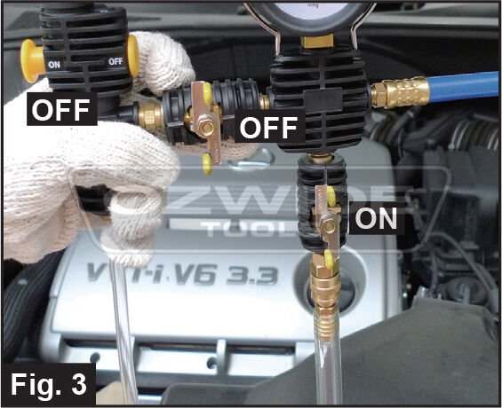 To use the included Vac down system, drain the cooling system, connect the various vac down pieces, connect to shop air, suck all the air out the system and then using that suction within the system it fills the cooling system full of new coolant from the bucket you have set aside with fresh coolant in.