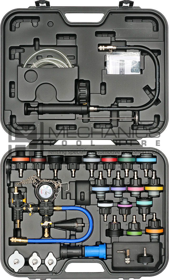 This Radiator pressure test kit is designed for testing leaks in automotive cooling systems and also has the facility to refill the cooling system via the sets anti-airlock Vac down system.